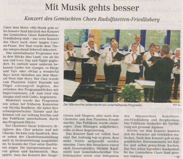 festliches Willkommen Vieni sulla barchetta Vo Lozärn uf Weggis zue Buretanz (Kanon) Lueget, vo Bärgen und Tal I gan nid hei bis ‘s wälleled Wahre Freundschaft All mein Gedanken, die ich hab Mit Musik geht alles besser So schön wie heut’ Licht What a wonderful day Flying (Kanon) Tonight - aus West Side Story Maria - aus West Side Story A summer’s over (Kanon) (When you wore a tulip) Goodnight sweetheart Jetzt ist Schluss (Kanon) Sambabrasil (Kanon) |